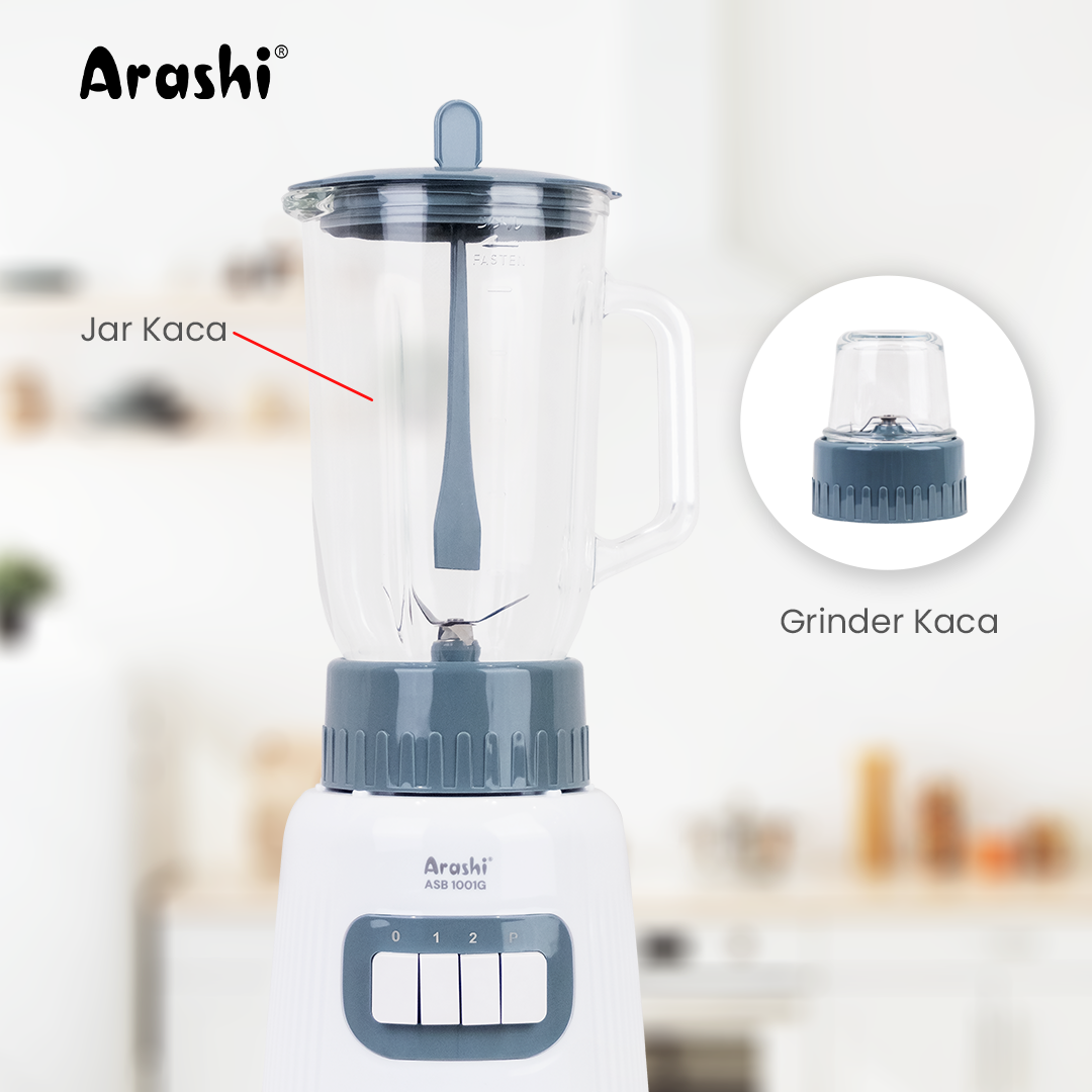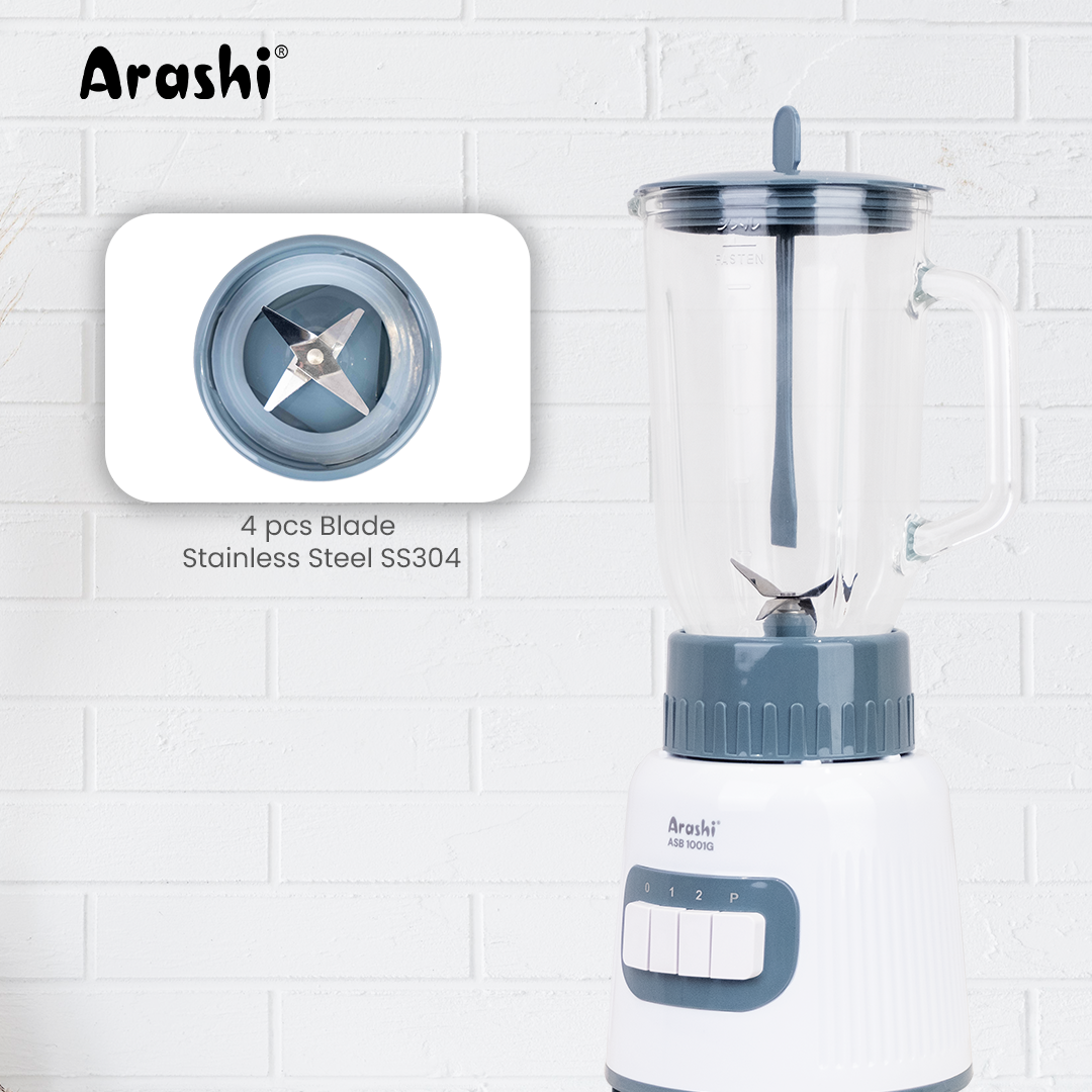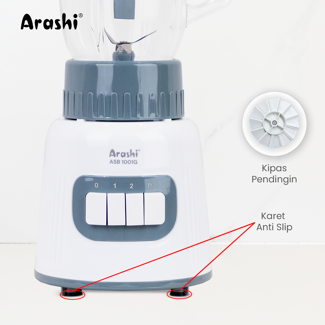 Arashi Stand Blender ASB 1001G memiliki tingkat kebisingan yang rendah dengan perputaran pisau hingga 21.000 rpm. Blender ini memiliki 3 kecepatan: 1, 2, dan P (Pulse) serta dilengkapi dengan Grinder berbahan kaca.